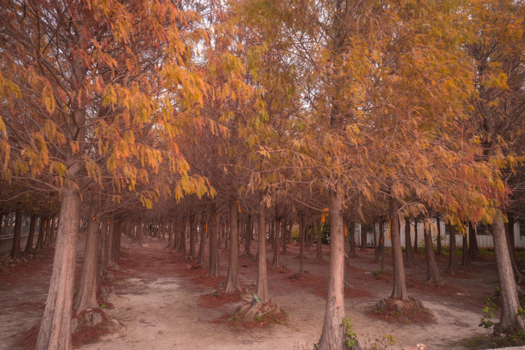 雖然叫作落羽松,但其實是杉樹的一種,原產於美國,但為甚麼不叫作落羽杉而稱作落羽松呢?原來台灣的落羽松是日治時期由日本引入到台灣,因此源用日文漢字寫法,稱為落羽松。而落羽松又稱為美國水松,所以有水賞和陸賞兩種,水賞的時候像濕地一樣,將樹根沉沒在水中,還有養魚。而陸賞的時候,紅葉散落,成為一大片厚厚的地毯。