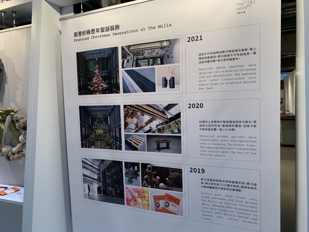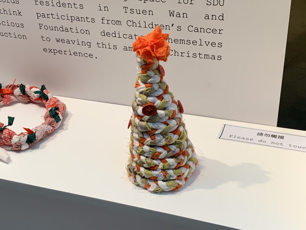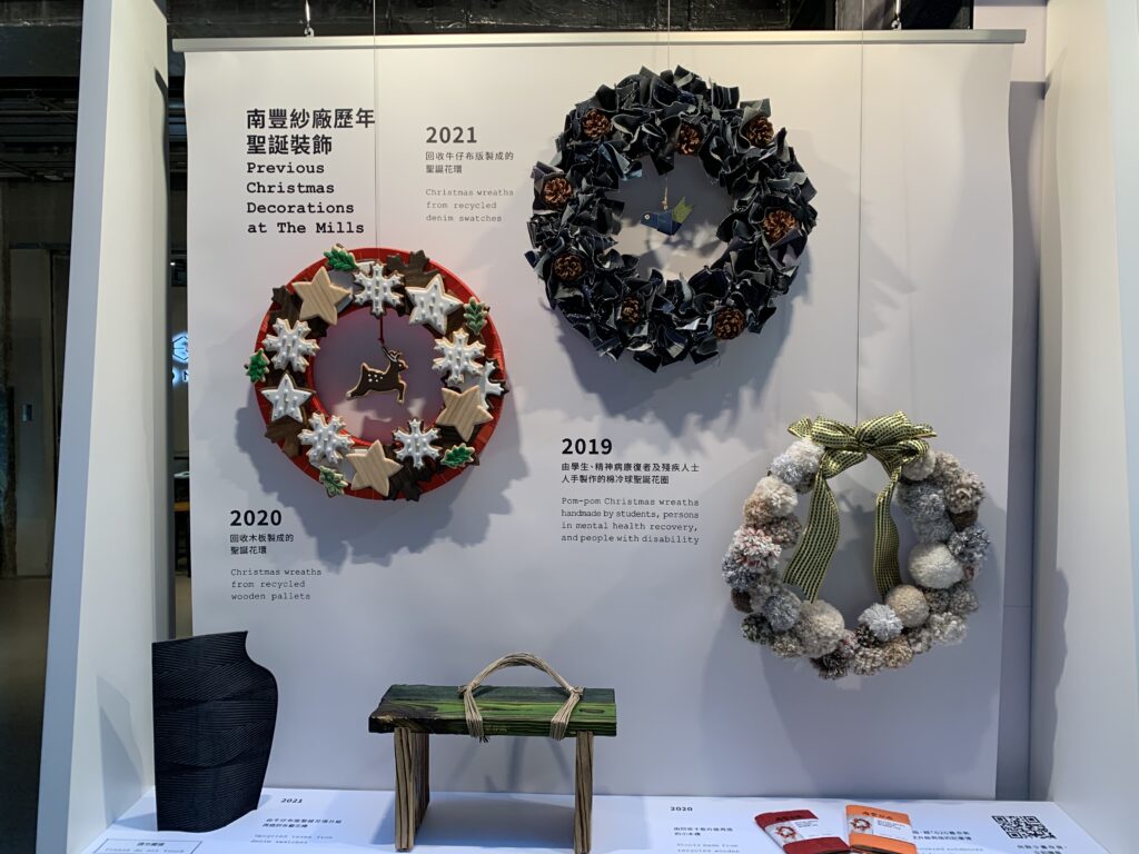 除了巨大的聖誕裝置,同時帶出衣物、配飾甚至聖誕裝飾如何做到可持續發展,其中一個聖誕裝飾是用回收的舊衣物剪成花布條再編織成環保花圈和環保聖誕樹,這個方向可以參考。