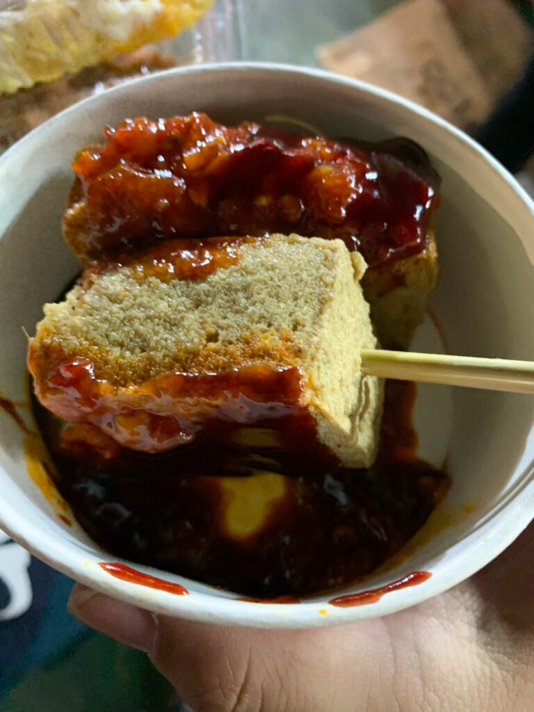 這次選準最後一天晚上過去,目標是像年宵一樣撿便宜貨,然而的確大部分商店都於晚上十時左右開始減價,像臭豆腐和蠔嗲甚至降到半價,實在便宜得多,除了撿便宜外,好吃的推介也有蠔仔麵線、串燒、花枝丸和燒魷魚等。
